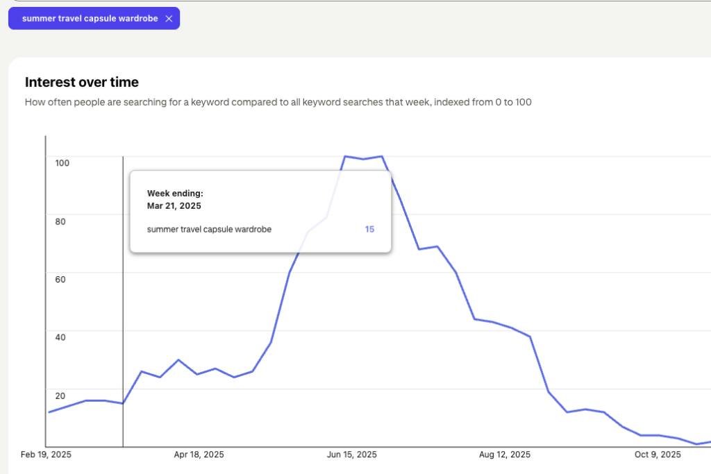 If you’re planning on writing about “creating a summer travel capsule wardrobe,” for example, that search is starting to trend upwards at the end of march which is when you want to publish the content. That way you can share it on Pinterest and it has time both to rank and to be found before it peaks and then quickly drops off in June.